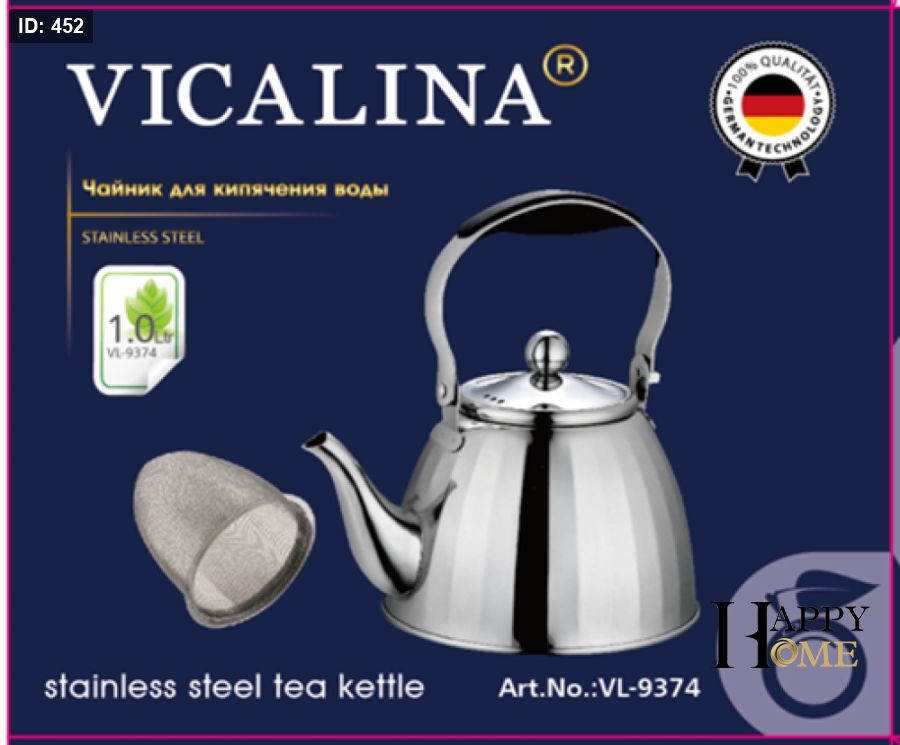 إبريق شاي فضي (لون ستانلس ستيل لامع) من شركة Vicalina (بتقنية ألمانية وجودة عالية)، مصنوع من الستانلس ستيل الغذائي المقاوم للصدأ والتآكل.