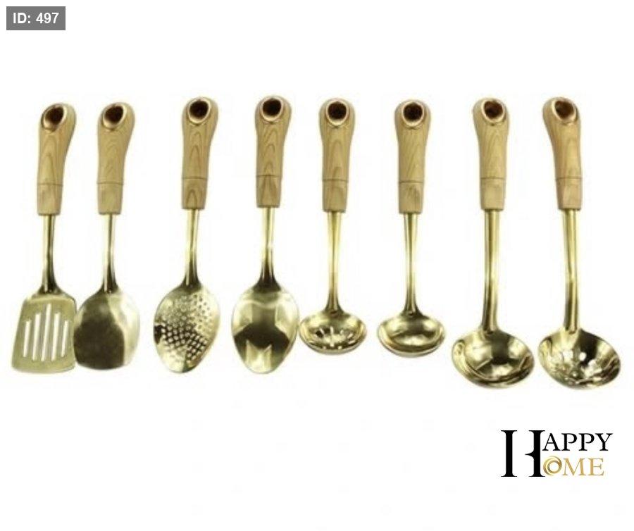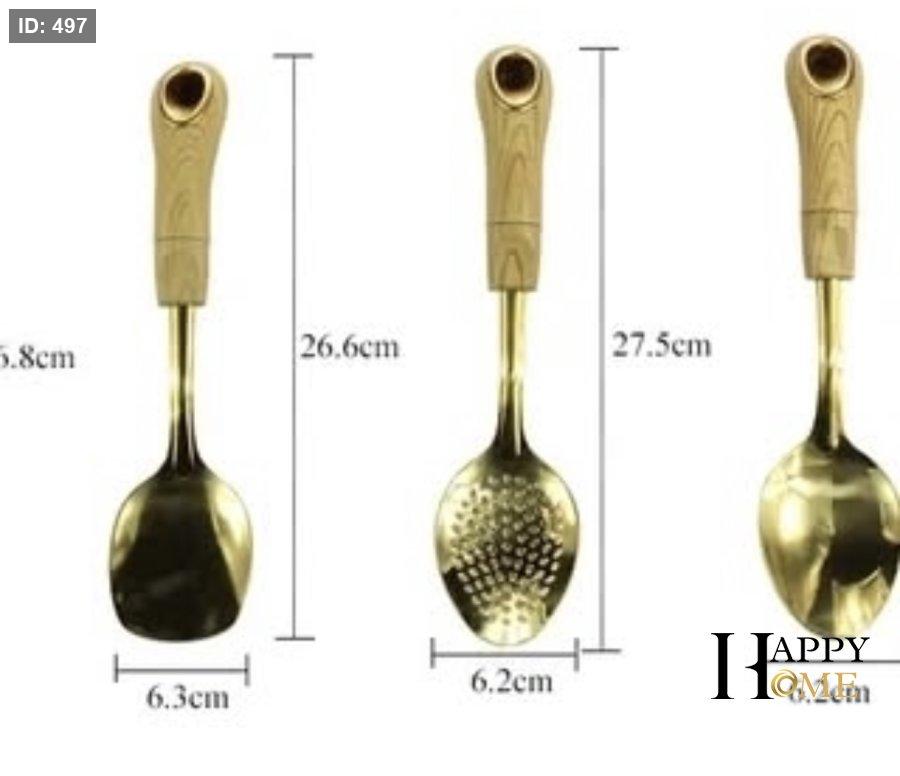 مجموعة مغارف وأدوات طبخ متنوعة الأشكال بلون ذهبي لامع راقي يلمع كالذهب الحقيقي، مع مقابض خشبية مريحة وطبيعية لإمساك آمن وغير حار.