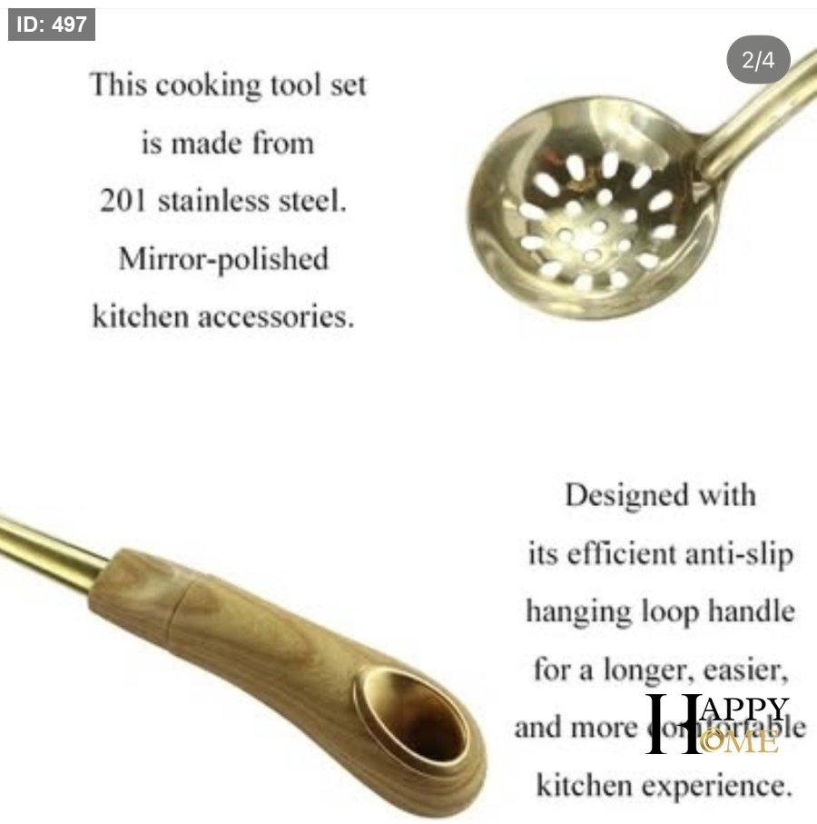 عرض فاخر لا يُقاوم! ✨ مجموعة مغارف طبخ ذهبية أنيقة مع مقابض خشبية